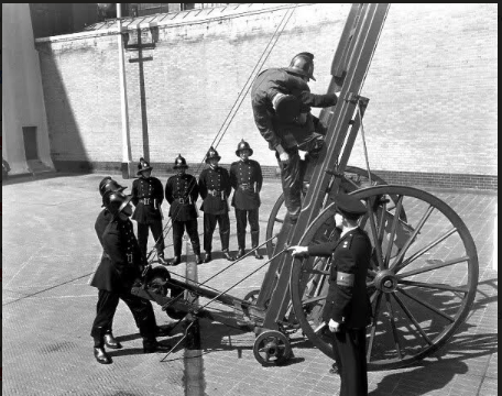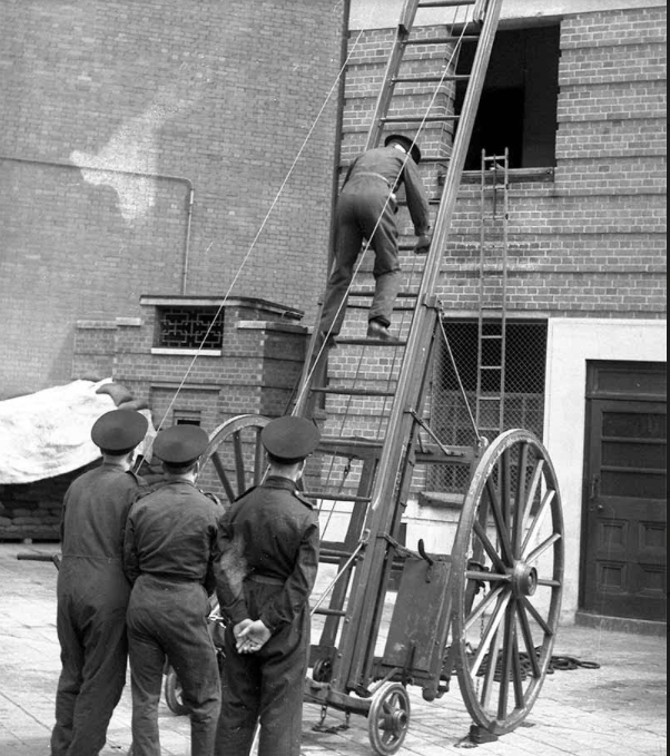 Fire fighters would have to be able to carry a person down this ladder in a rescue situation ( see photo ) and one time Paul was to be the casualty, he was attached by a rope that would break his fall should he fall off, and fall off he did, the rope broke his fall it gave him quite a scare but he landed on his feet.