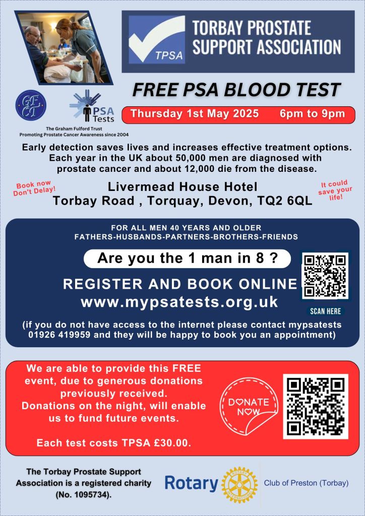 Following the talk given to us recently by the TPSA, they have been kind enough to invite Probus members to free tests, details as shown below. If you are aged 40 and over and have not been tested recently you really need to use this opportunity. It could save your life.